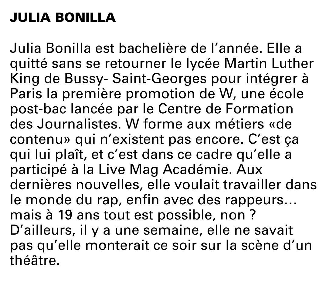 En 2016 j’intègre une école de journalisme, ça ne colle pas, je ne m’y retrouve pas. Je finirai par quitter cette filière au bout d’un an. A l’époque pour valider l’un des modules de mon année je devais me plier à un exercice, celui du « Live Magazine Academy ». Pour rentrer dans les détails techniques, comme sa traduction le laisse deviner, c’est un journal vivant. Reconnu dans le monde journalistique, des reporters, des photographes, des écrivains, des réalisateurs se succèdent sur une scène pour raconter une histoire. « Des récits intimes et planétaires, fondamentaux pour ceux qui les racontent, inoubliables pour ceux qui les écoutent. »